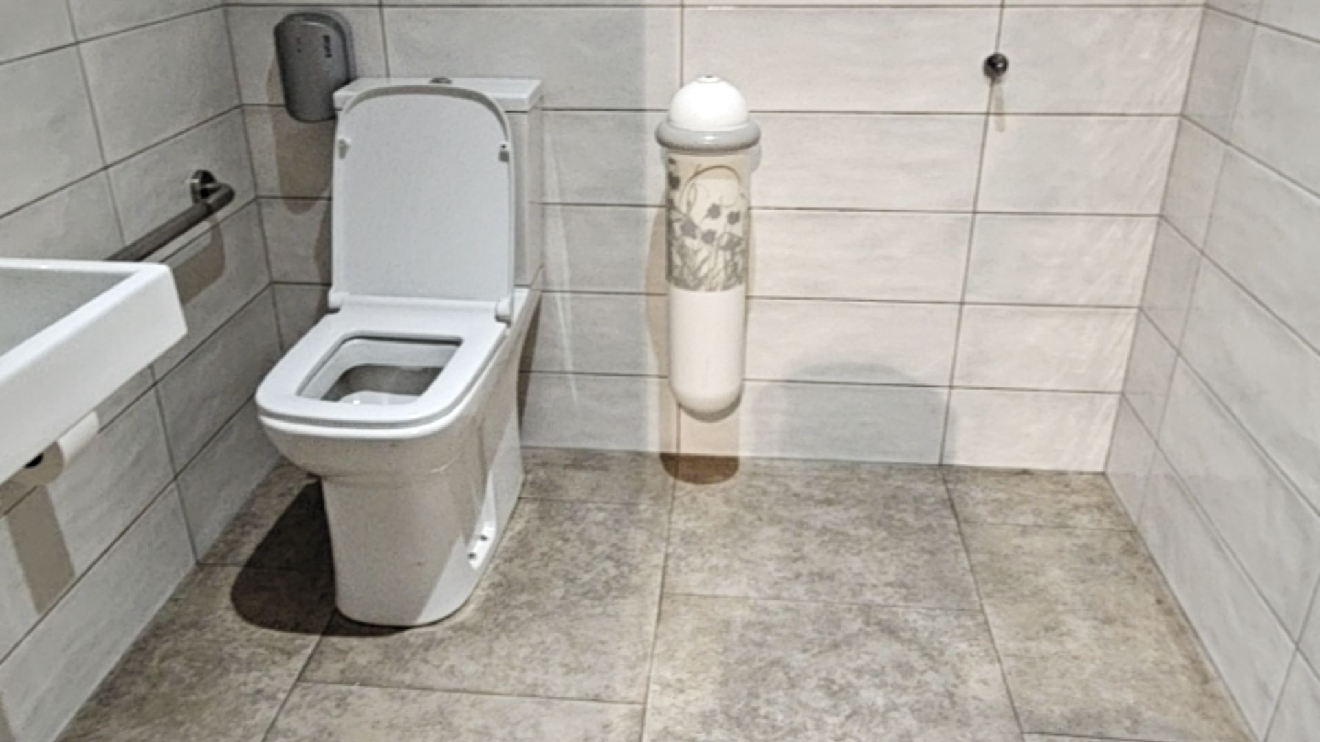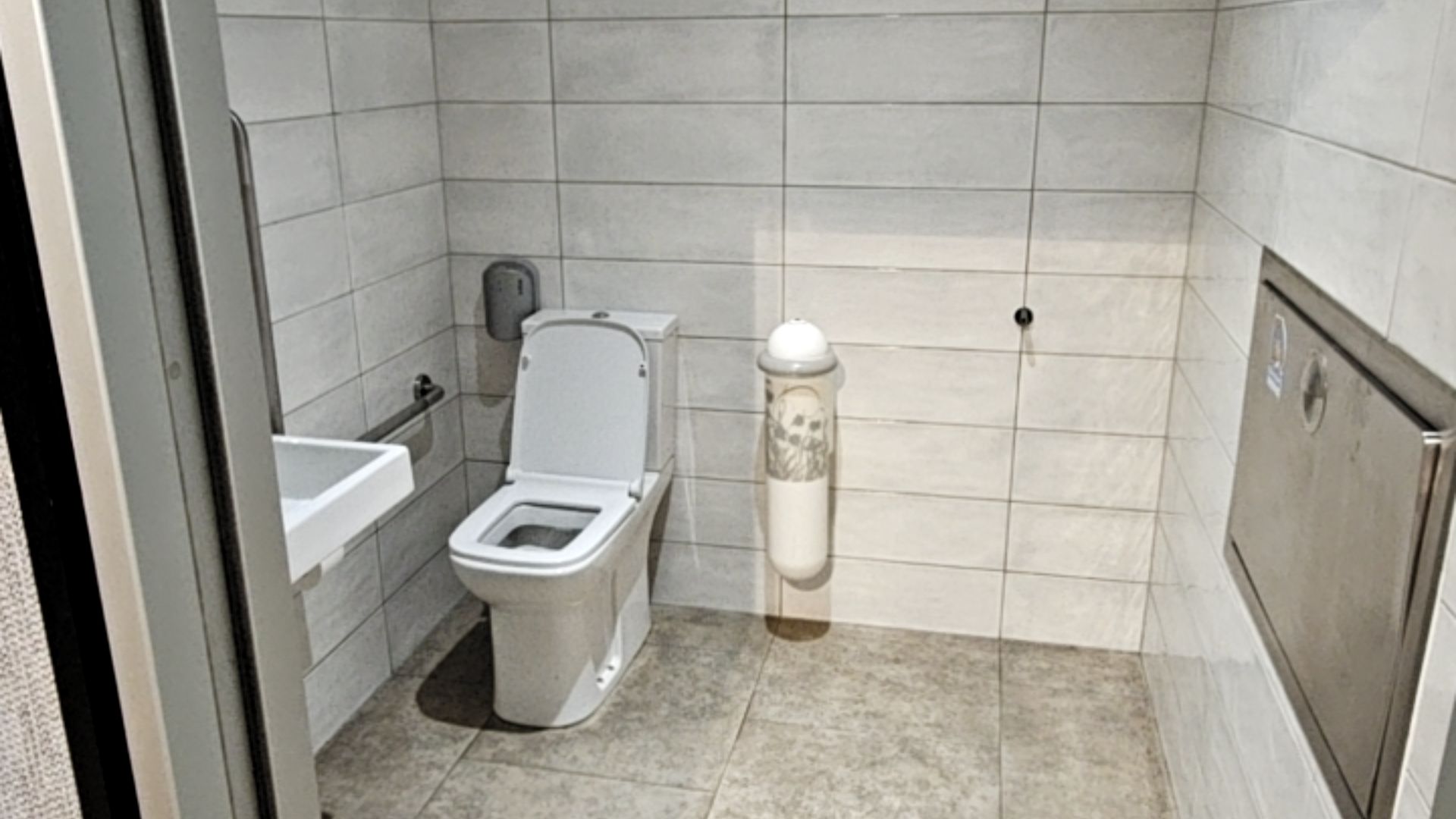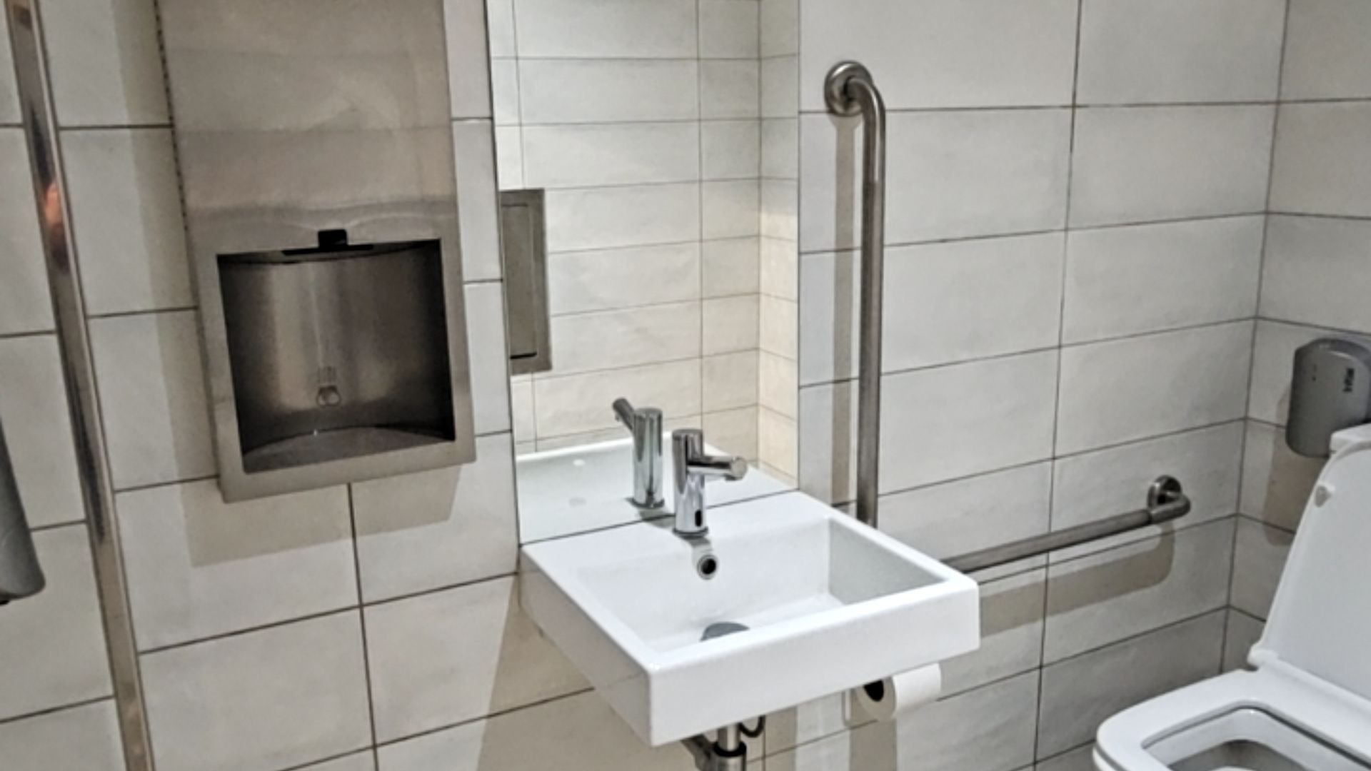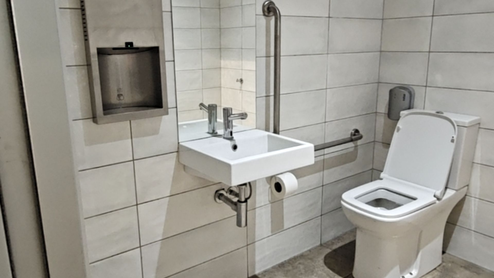 - Wash basins, mirrors, soap dispensers, and electric hand dryers are all positioned at accessible heights.