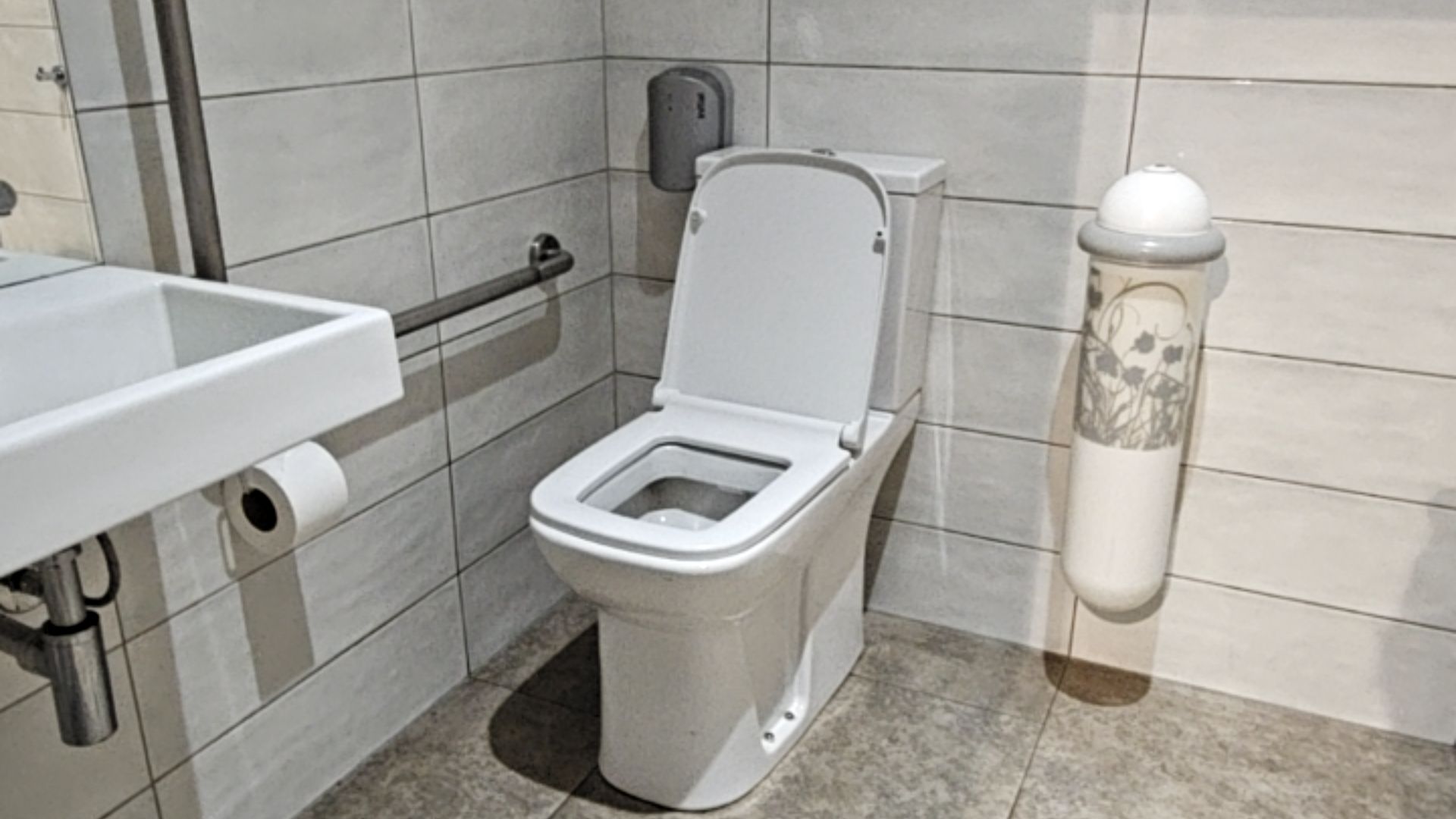 - Toilets are at an accessible height (450-480mm from floor to seat), with grabrails and a transfer space to the right.